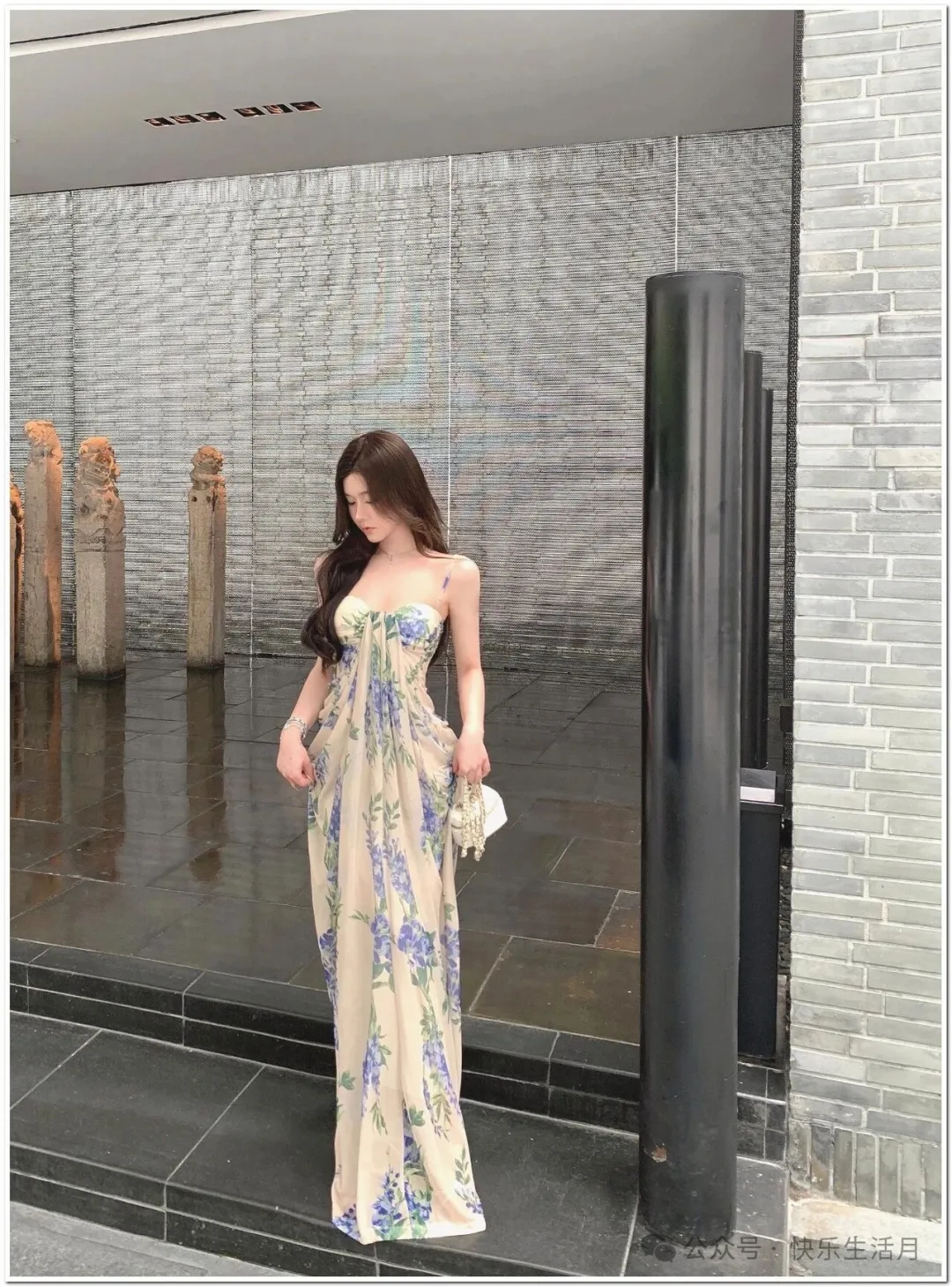 午後、ホテルのロビーで友達を待っていました。私は水辺や本棚の前をゆっくりと歩き回った。驚くほどリラックスした気分になりました。裾に青と紫の花がついたロングスカー…