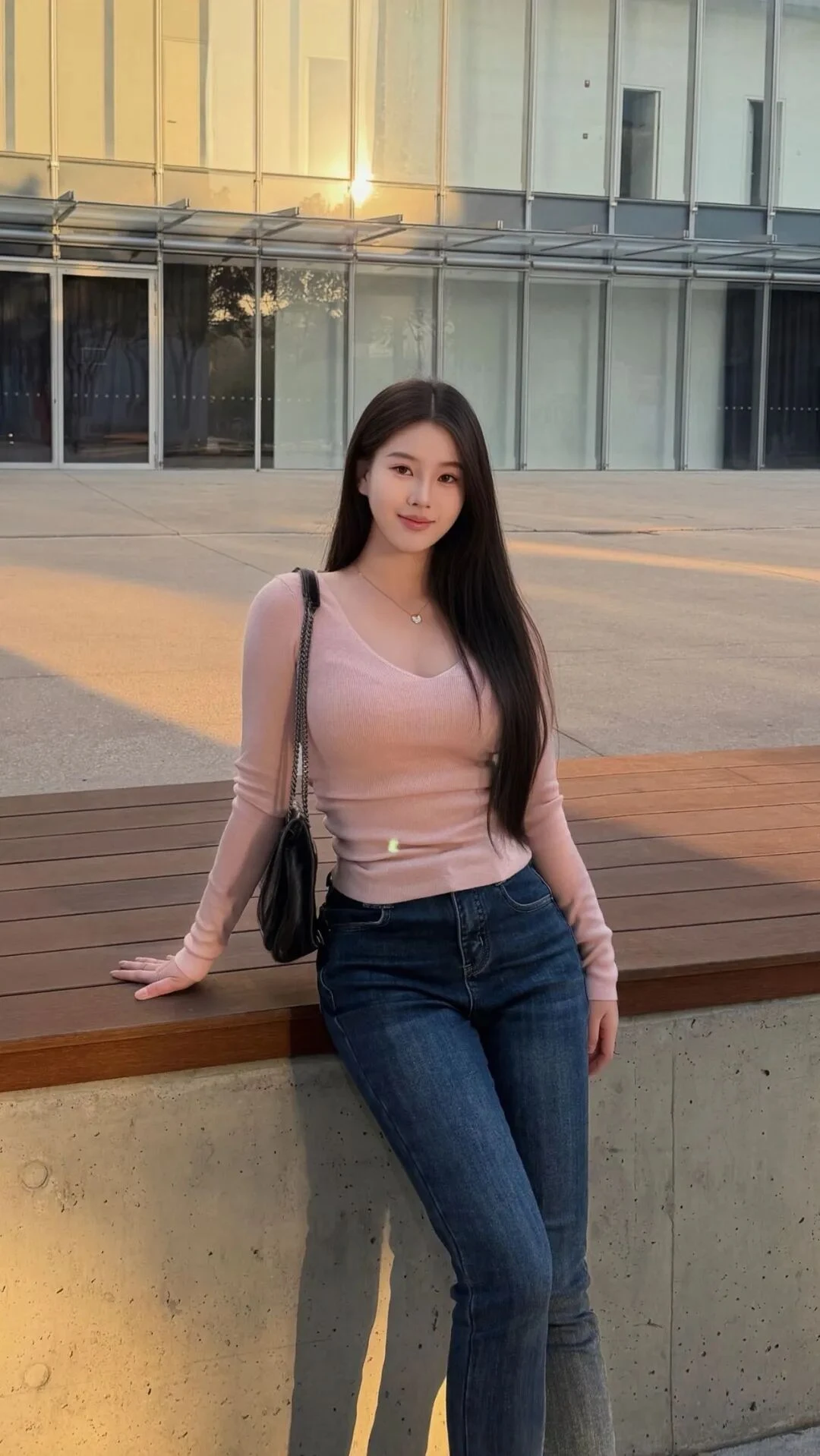 长椅上坐下、一方の足を轻轻弯曲、一方の手をの後方で体を支えてカメラを見ます。