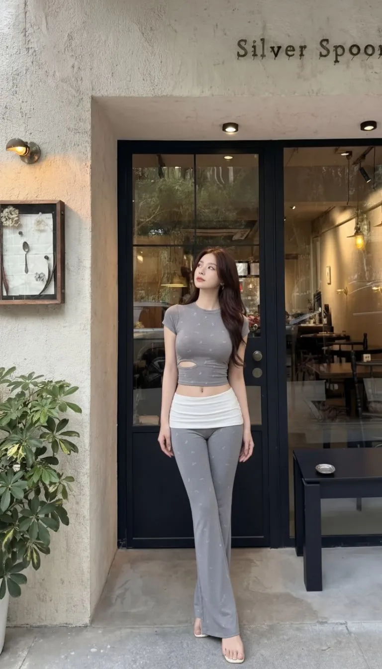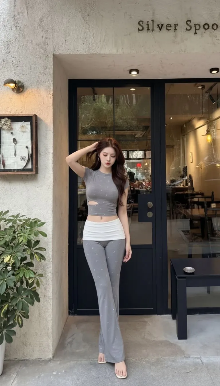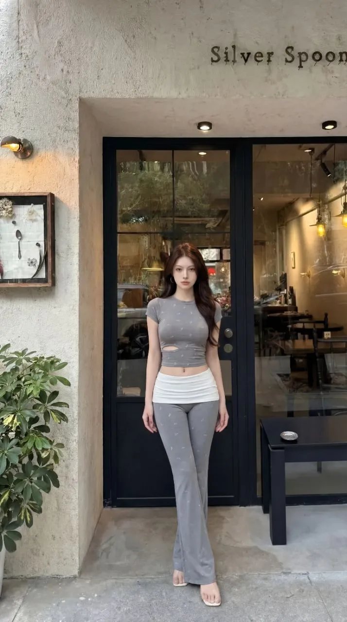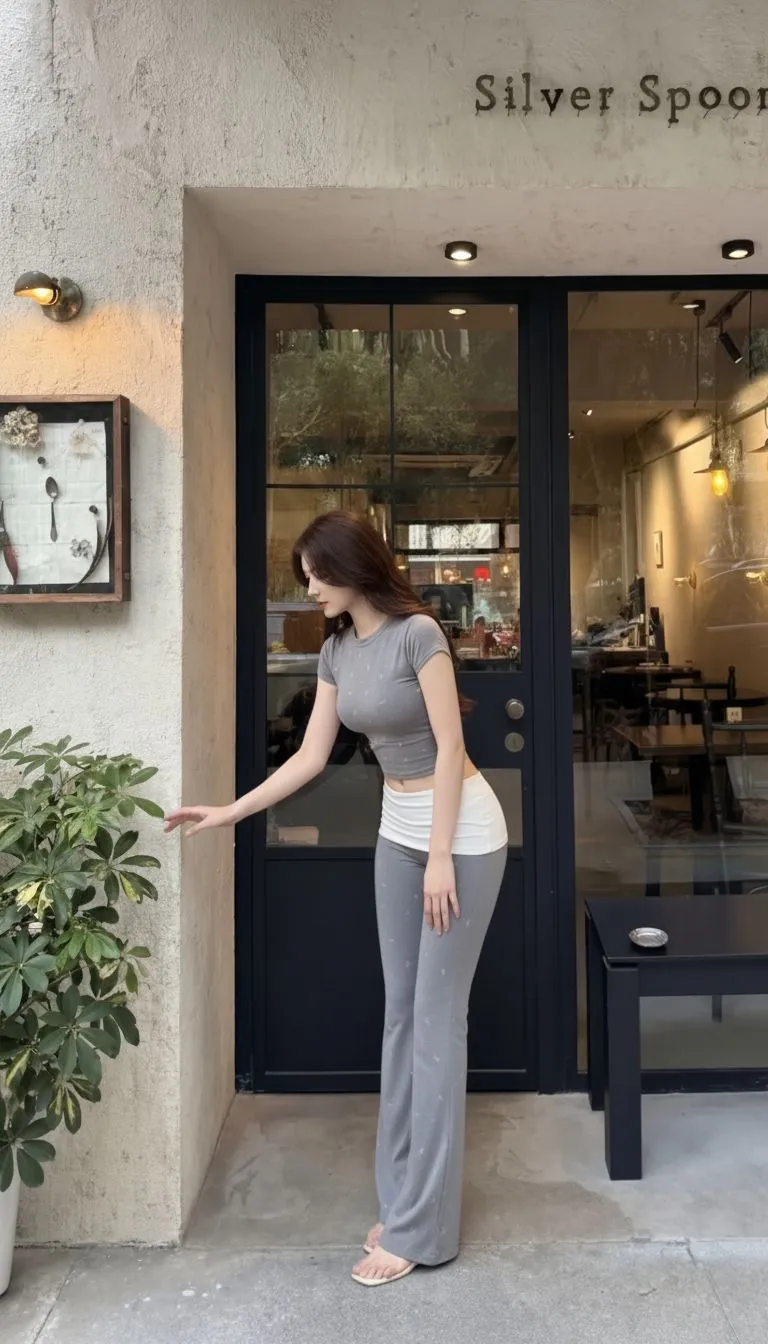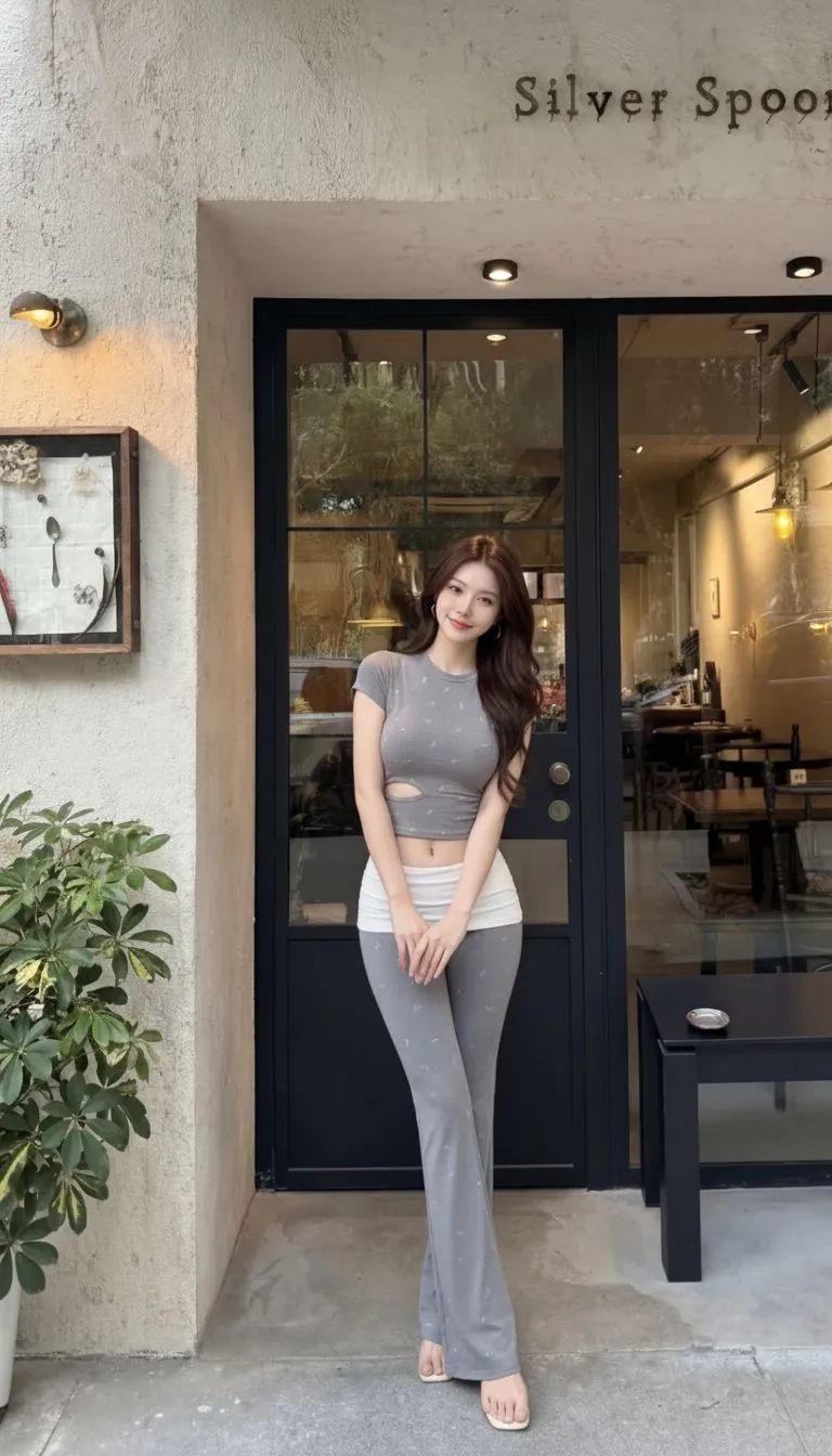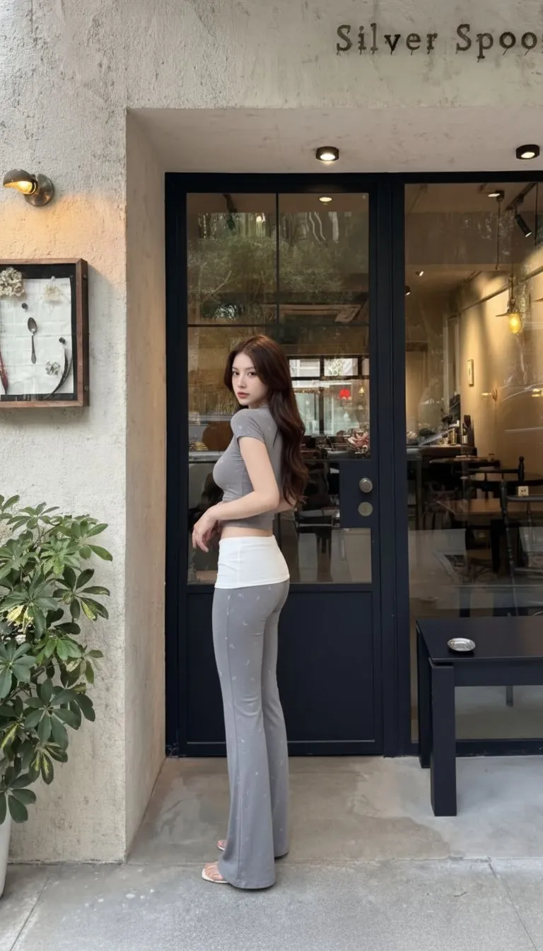 お店の前で写真を撮る際は、まず入り口で足を組んで立ち、体を少しリラックスさせ、両手を自然に体の横に下ろしてみてください。そうすることで、全身がよりリラックスした印象になります。そしてカメラに向かって優しく微笑めば、このポーズはシンプルでありながら美しく、写真映えする仕上がりになり、画面もすっきりとして雰囲気のあるものになります。