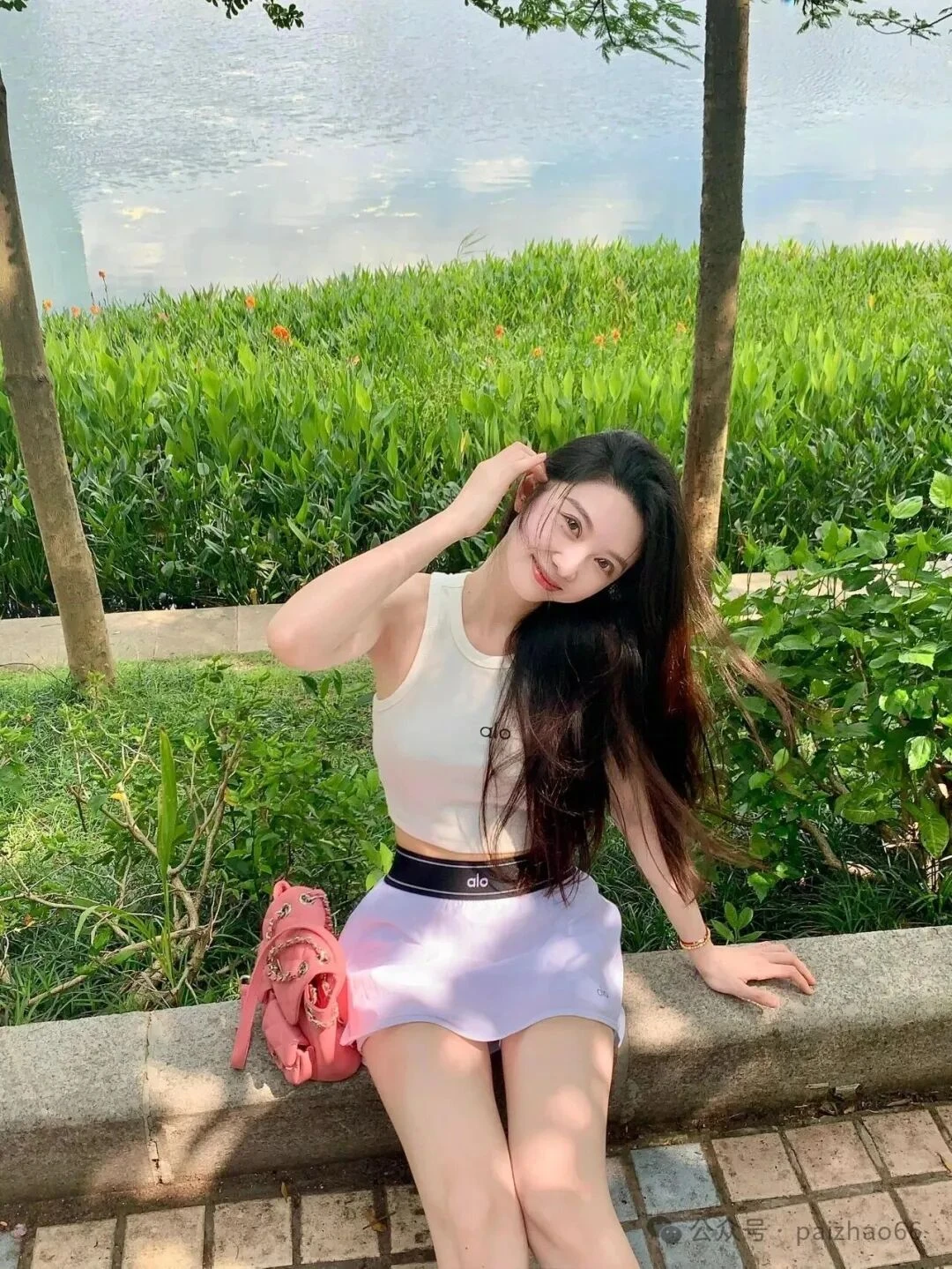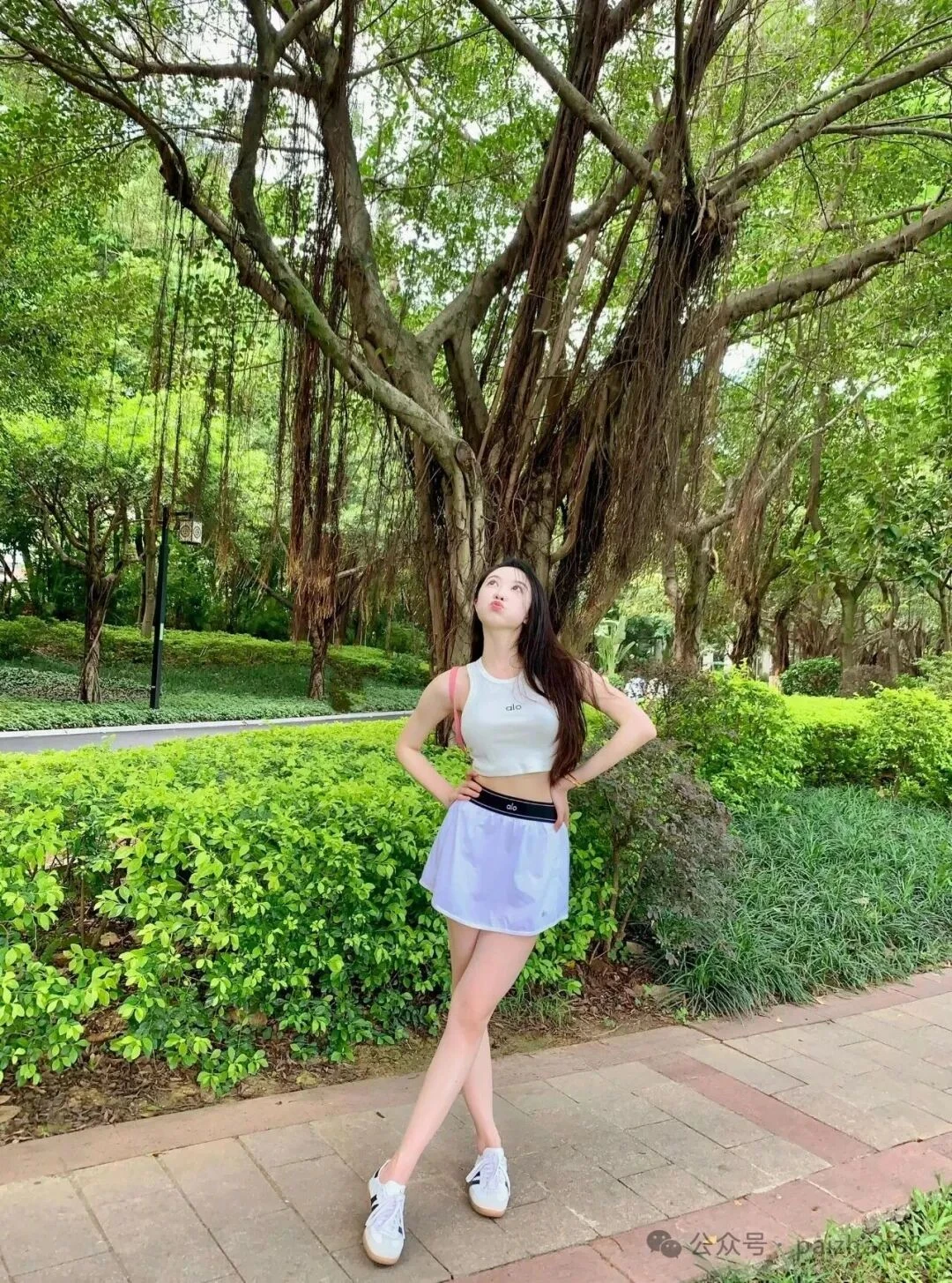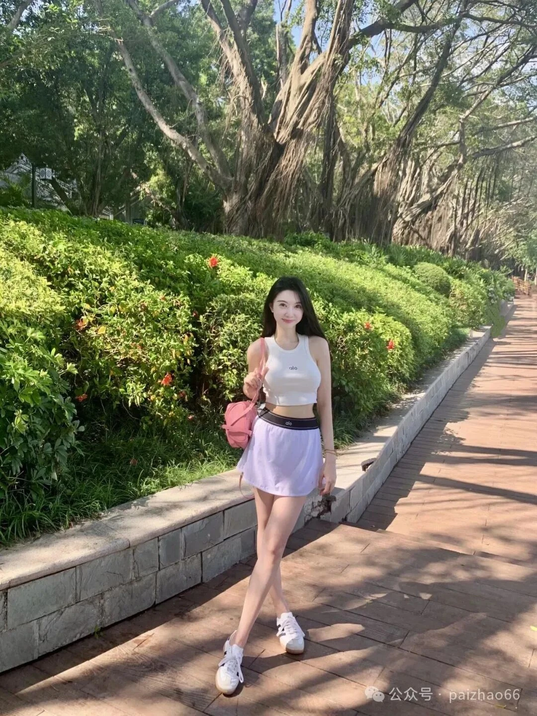 公園の小道の上に立って、背景に少し延伸感をさせます。片手を持ち上げて少し髪を触れ、カメラを見て轻轻笑います。この写真を撮る动作は自然で、ワンピース写真がもっと自然で、全体的状態が轻松で、干净的好看。