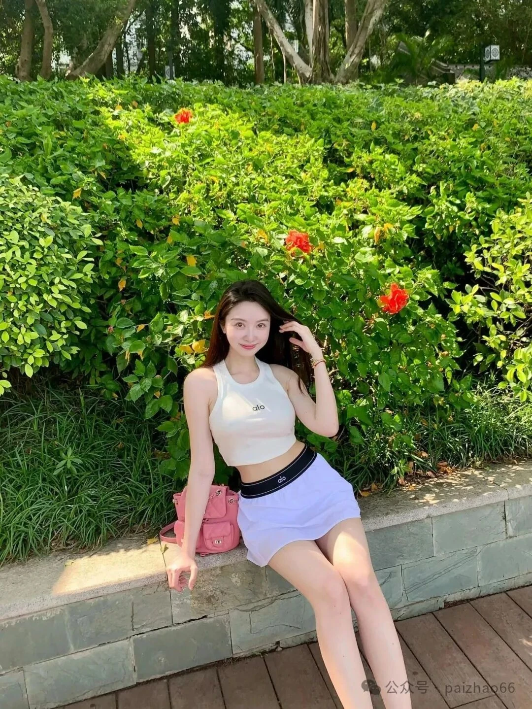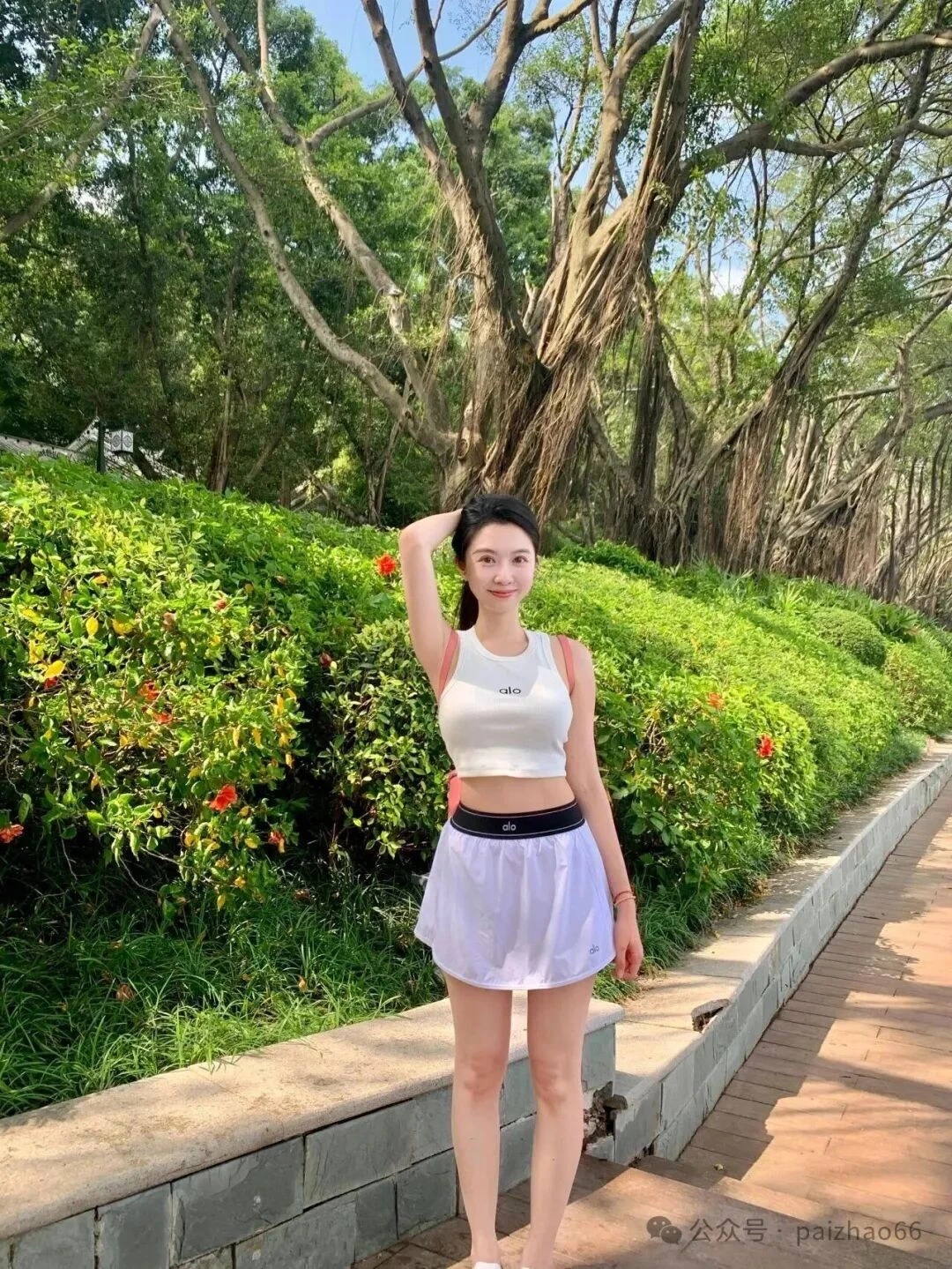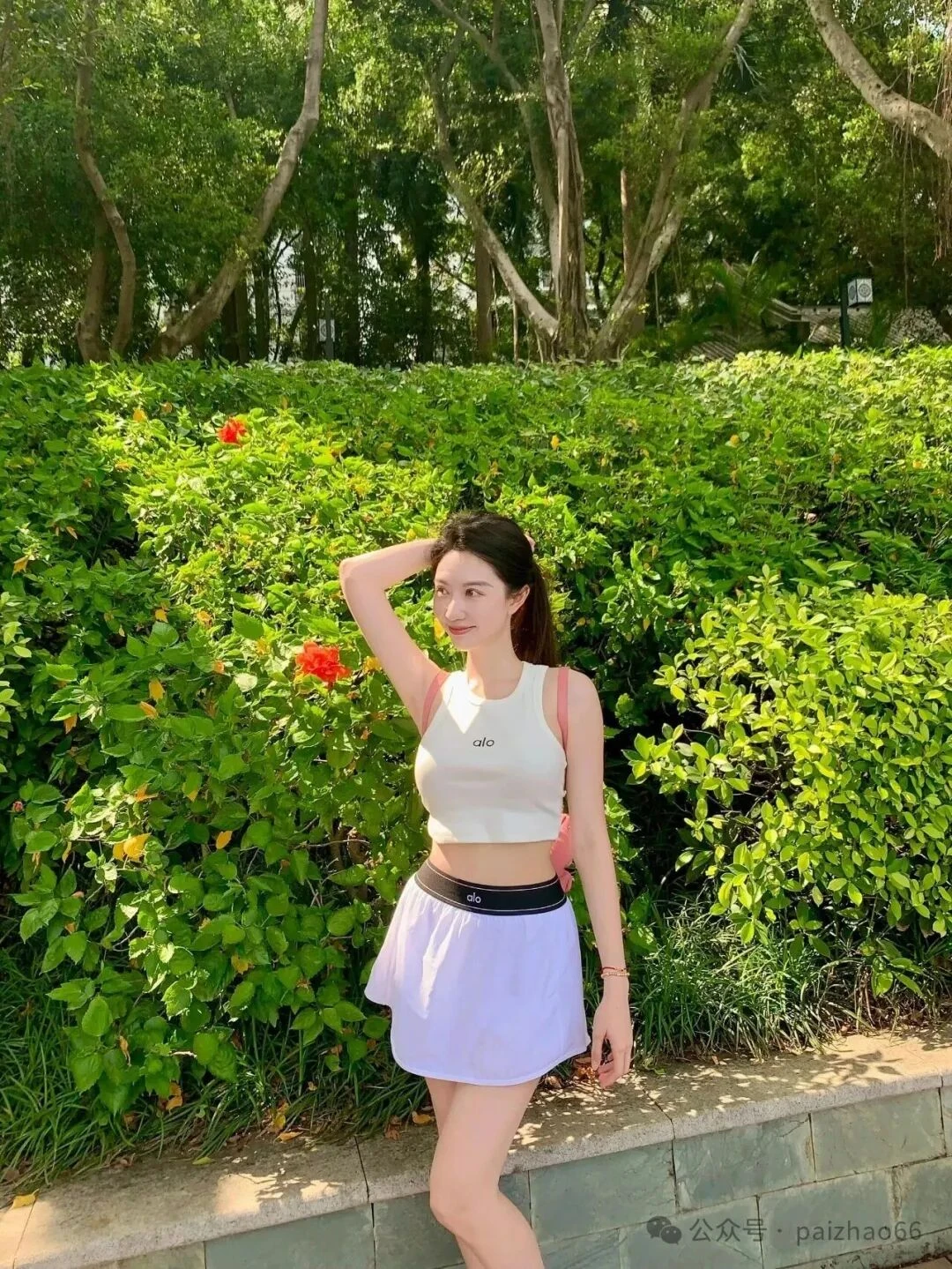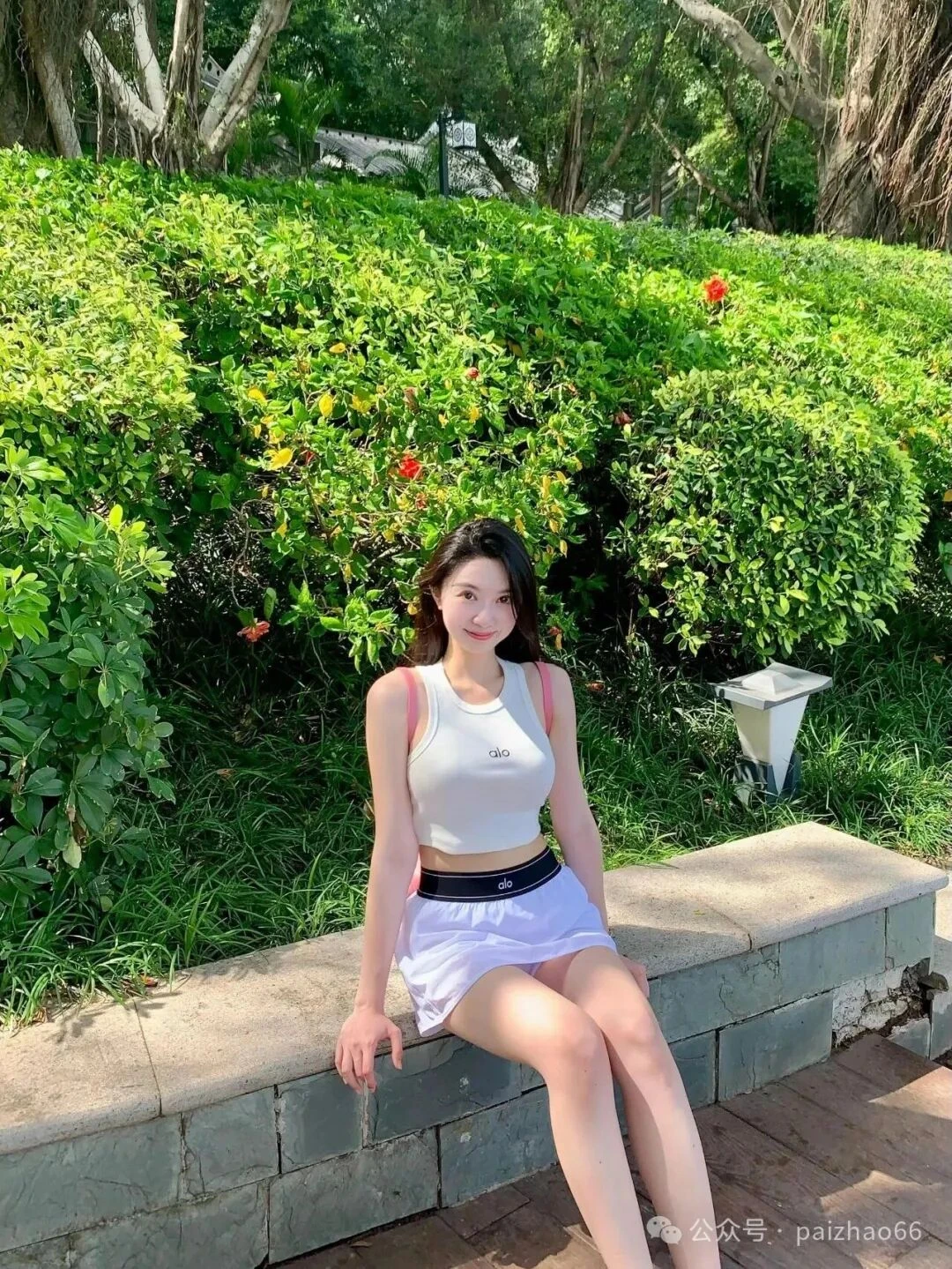 公園の小道の上に立って、背景に少し延伸感をさせます。片手を持ち上げて少し髪を触れ、カメラを見て轻轻笑います。この写真を撮る动作は自然で、ワンピース写真がもっと自然で、全体的状態が轻松で、干净的好看。