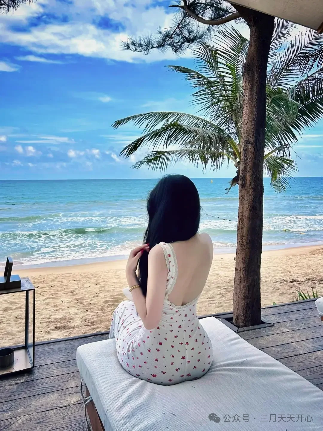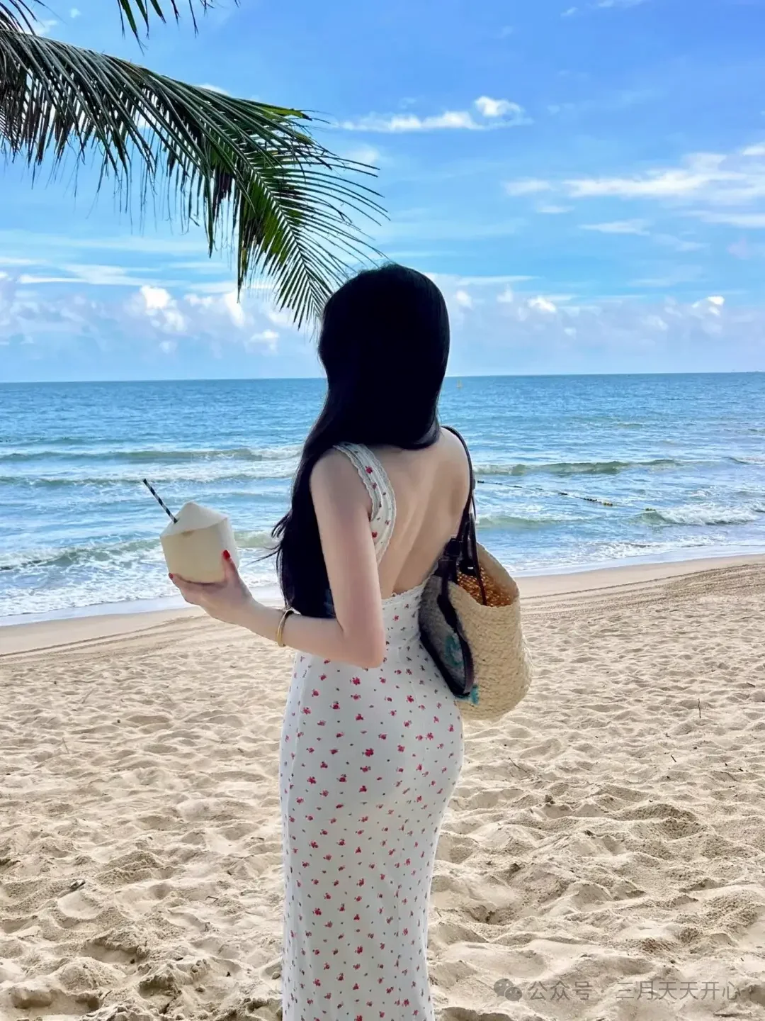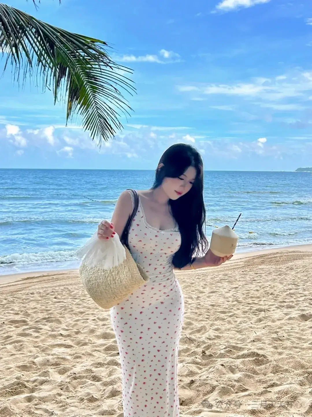 特に、白い花柄のロングドレスにラフィアバッグを合わせ、ココナッツと海景色を背景にすれば、絶対に素敵な写真が撮れるはずです。次に海に行く時は、ぜひこの5枚の順序通りに撮影してみてください。もしかしたら、一番雰囲気のある写真は、実はこうした一見何気ないポーズから生まれるものだと気づくかもしれません。