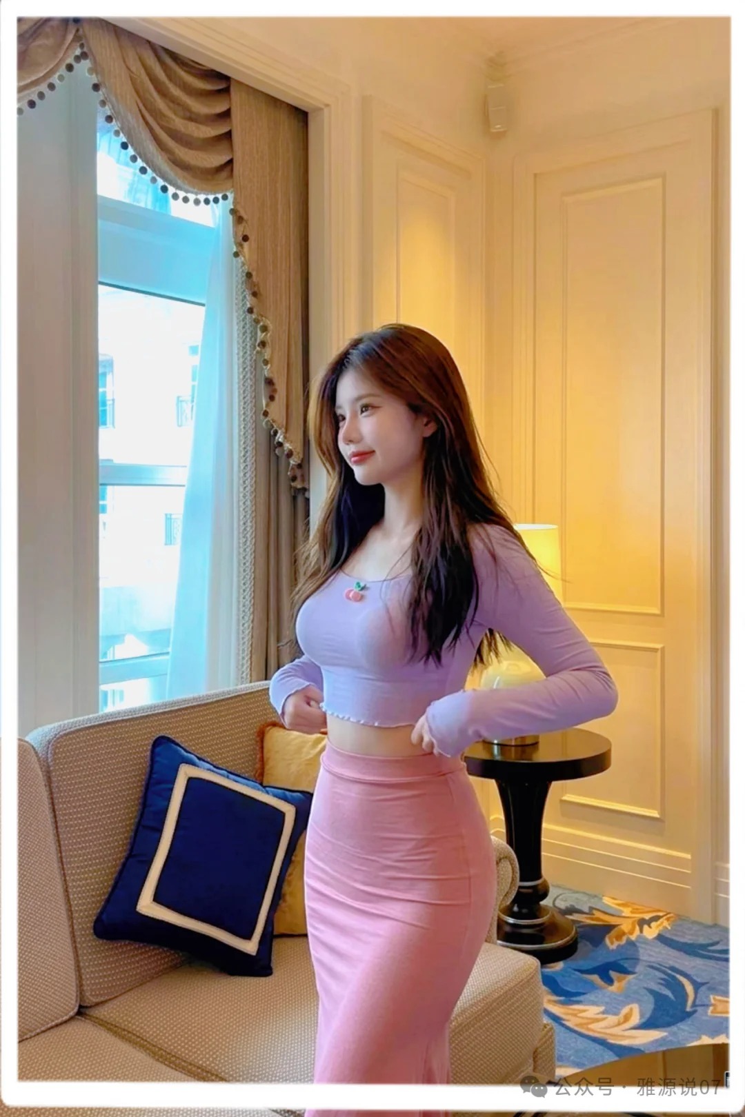 トップスは淡い紫色のショート丈ニット。ボトムスにはハイウエストのピンクのスカートを合わせました。