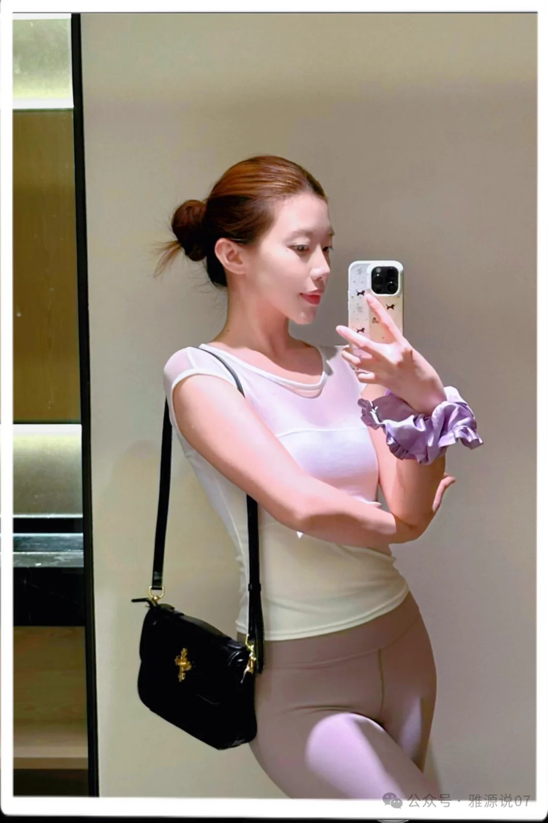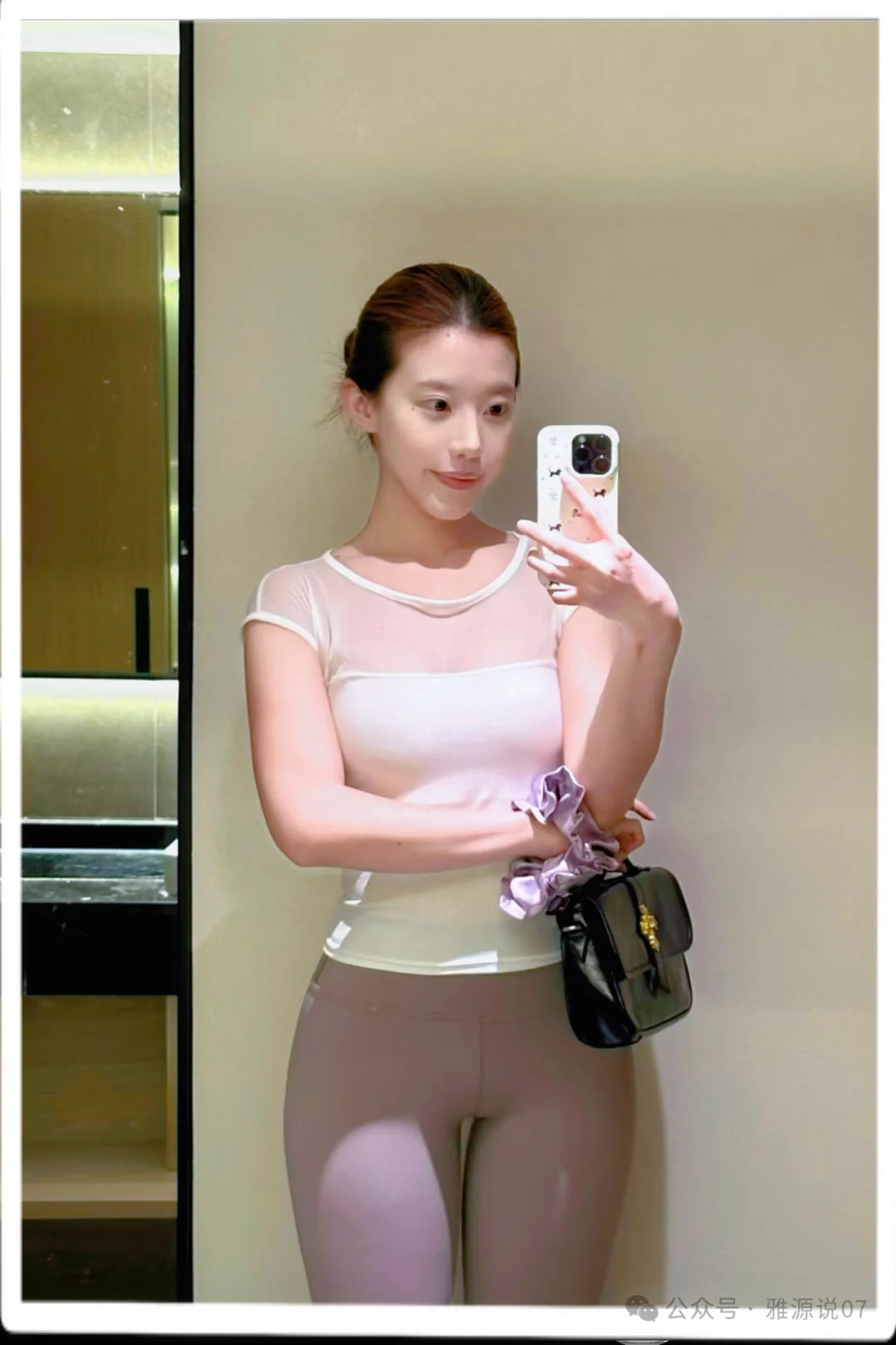トップスは白の薄手の半袖。ボトムスはグレーがかったベージュのハイウエストレギンス。