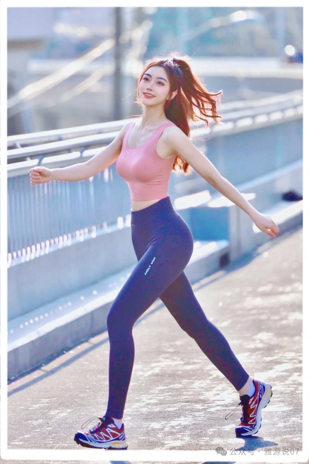 最後に紹介するのは、とても生き生きとしたコーディネート。トップスにはローズピンクのスポーツタンクトップ。