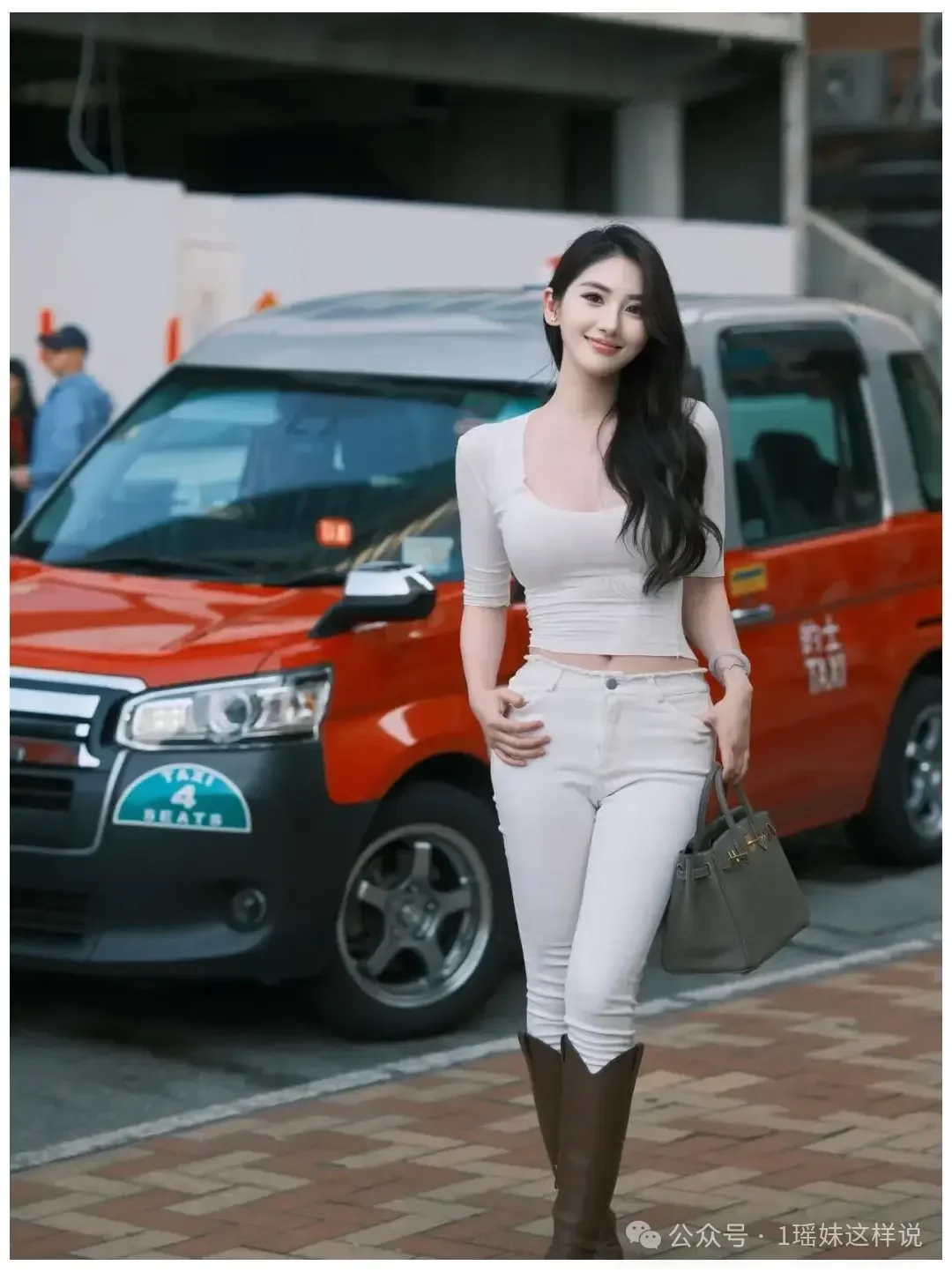 この写真は最初に撮る写真として最適です。体を少し前に出し、肩の力を抜き、片手を自然に垂らして、もう片方の手で髪にそっと触れて正面に立っている姿は、思わず洗練された印象を与えます。接写のメリットは、まず顔や様子を捉えられることです。背景の赤いタクシーはシーンを明るくする役割を担うだけで、シーンを圧倒するものではありません。動きのやり方がわからない場合は、安定性を最大限に高めるために、まずこの動きを学びましょう。