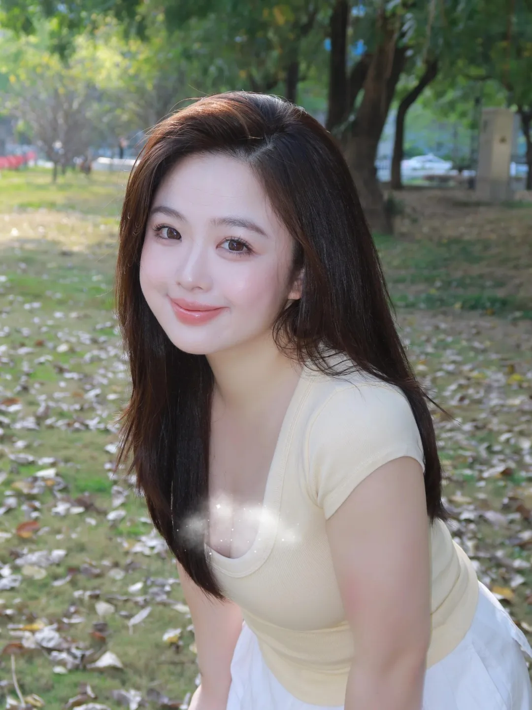 片手で優しくベンチの表面を保持し、ベンチの隣に立って、この姿势は、写真を撮るために肉の女の子のために非常に適している、ランダムなセックスを増加させるためにポケットに挿入されたもう一方の手は、寛大にカメラを見て目が笑容を出す。