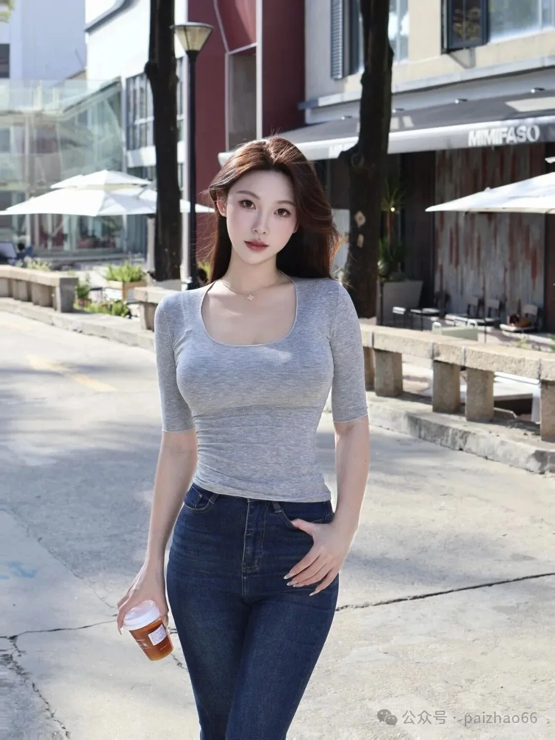 足を組んで立ち、片手をジーンズのポケットに入れ、もう片方の手にはコーヒーカップを持って自然に構えると、全体的に少し気取らない雰囲気が出ます。笑顔ではなく、少しクールな表情でカメラを見つめるとより印象的になり、ジーンズのシルエットも際立ち、よりスタイリッシュで美しく見えます。