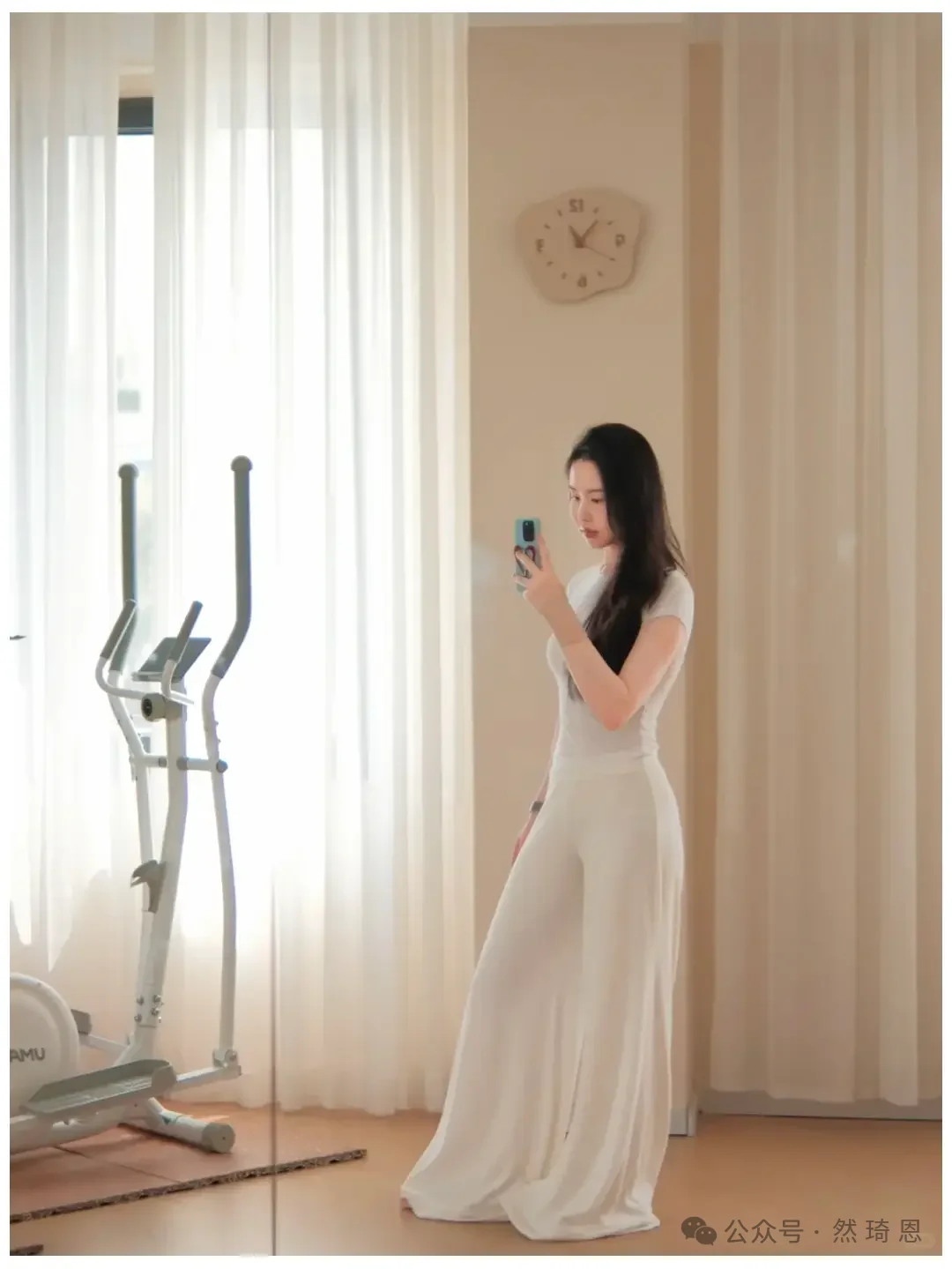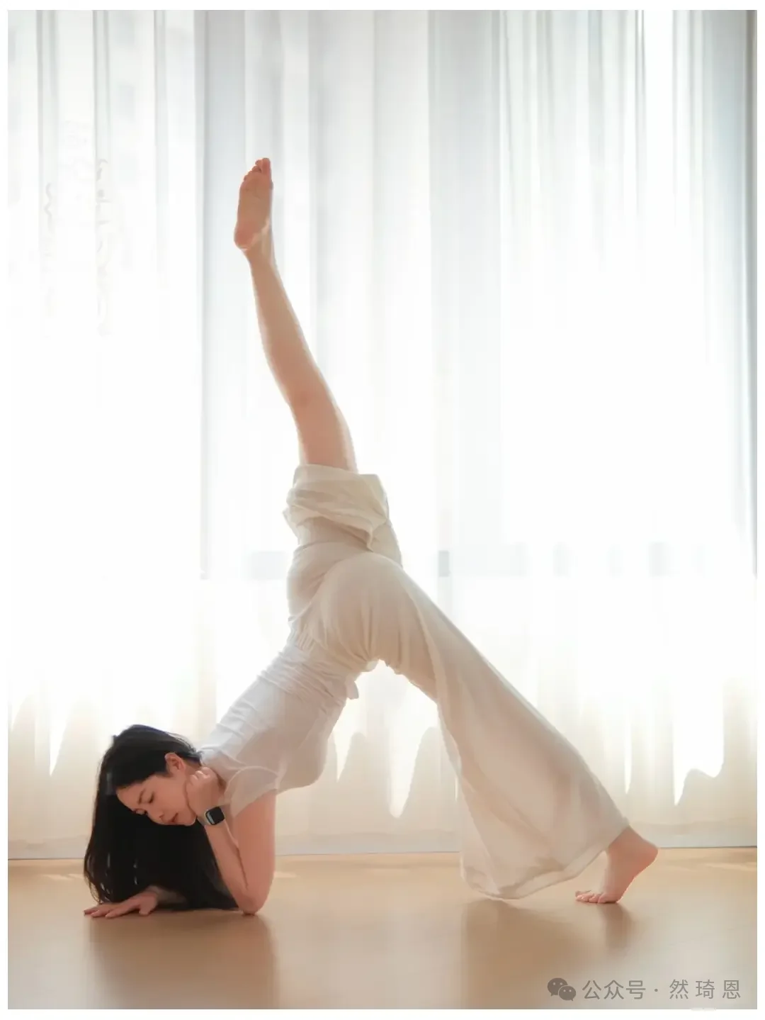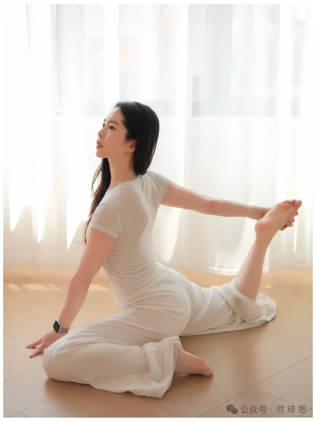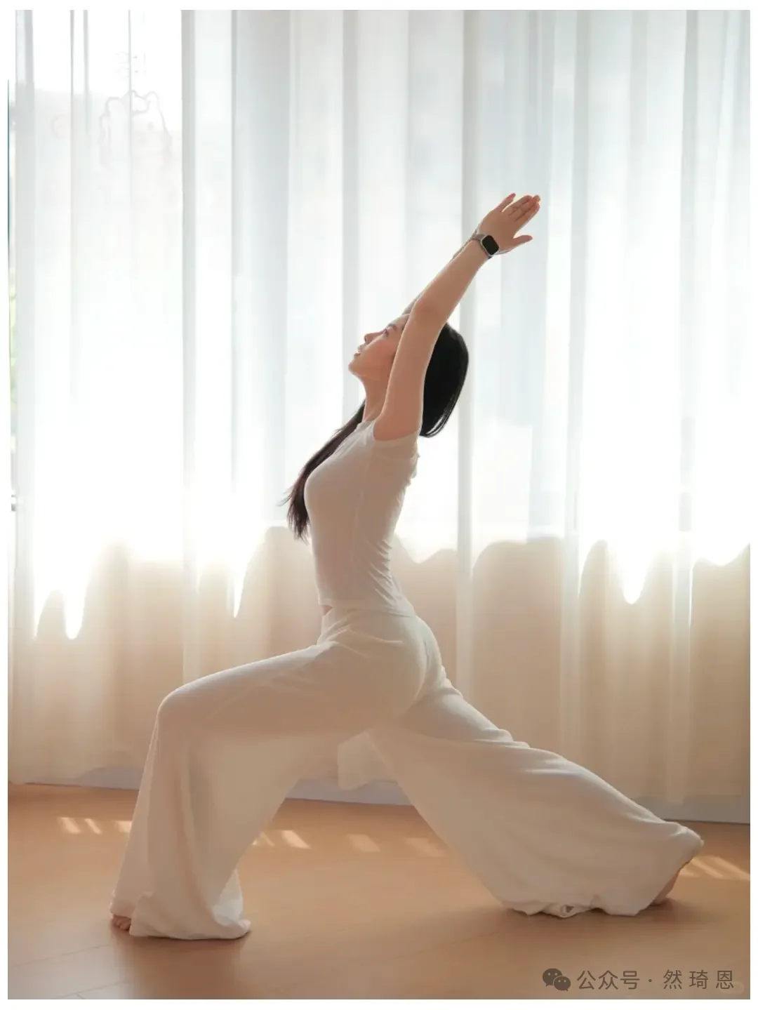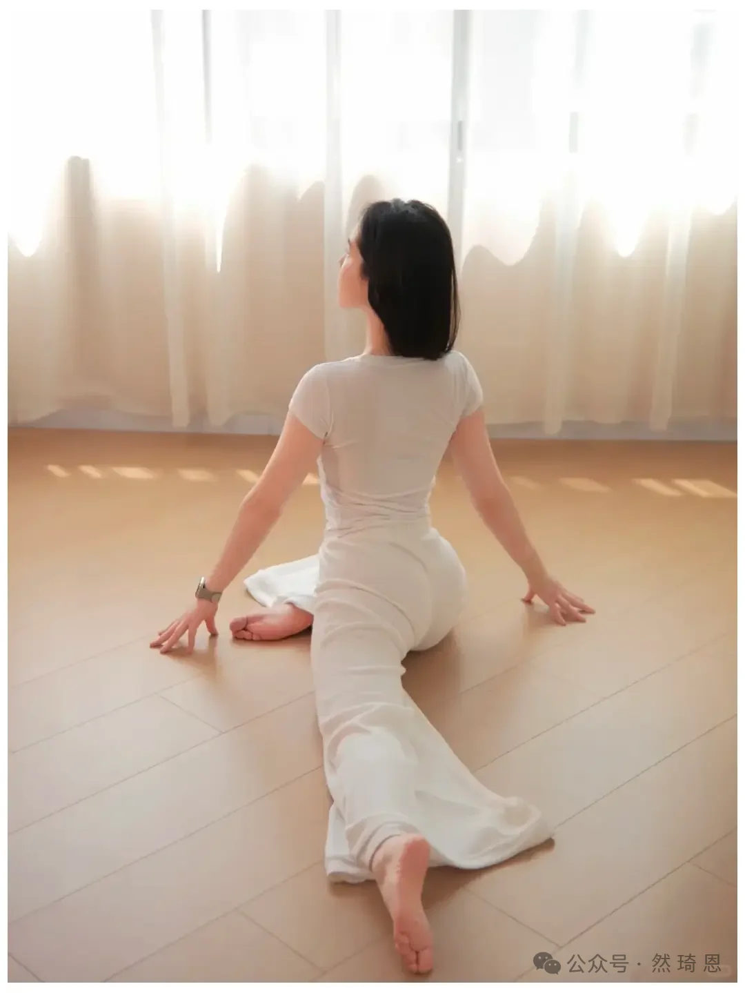 ヨガウェアをより上品に撮影したいなら、必ずしも難しいポーズを取る必要はありません。写真映えの秘訣は、たいてい体のラインの伸びやかさ、安定した姿勢、そして画面に漂う穏やかで落ち着いた雰囲気にあるものです。この一連の写真は、自宅で日常的に参考にするのに最適です。同じ白いヨガウェアを、同じ柔らかな光が差し込むカーテンの前で、ポーズを変えるだけで、全く異なる雰囲気の写真が撮れるのです。