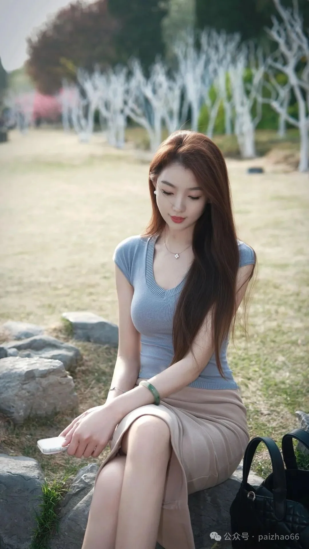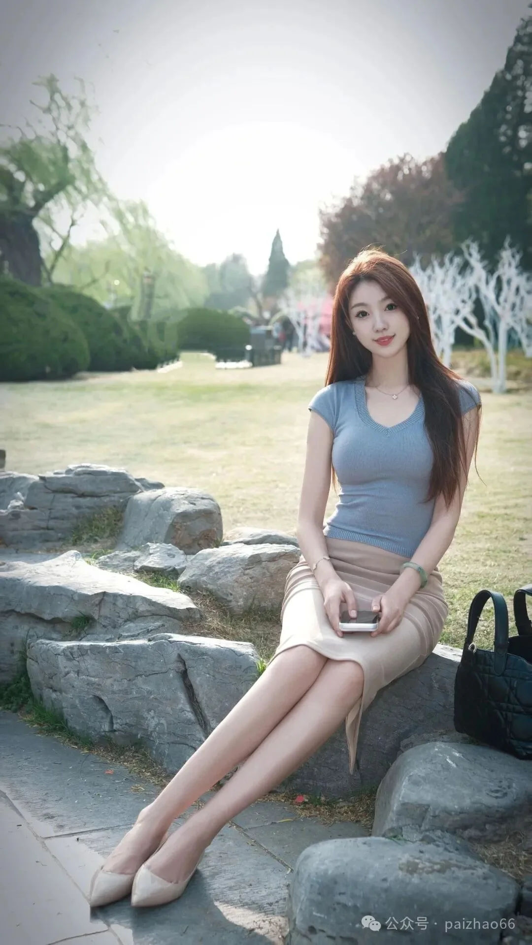 石の上に座るときは、両足を軽く横に広げましょう。動きは大きくしすぎず、手を自然に足の間に置いて体を支えます。そして、カメラに向かって首を傾けて微笑んでください。このポーズはリラックスした印象を与え、スカートを履いて撮るとさらに気品が際立ち、優しく美しい写真に仕上がります。