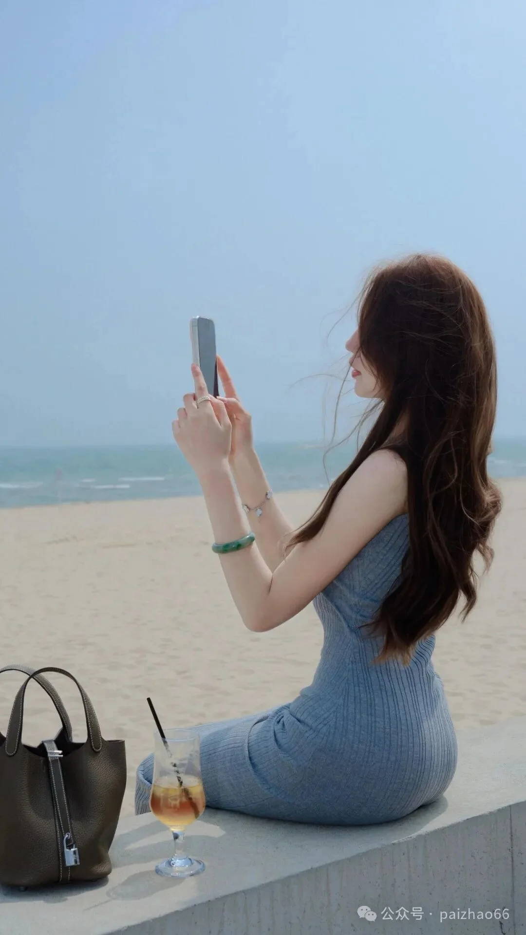 9、腰をくねらせてまっすぐ立ち、携帯電話を手に持ち、うつむいてシャッターを切る