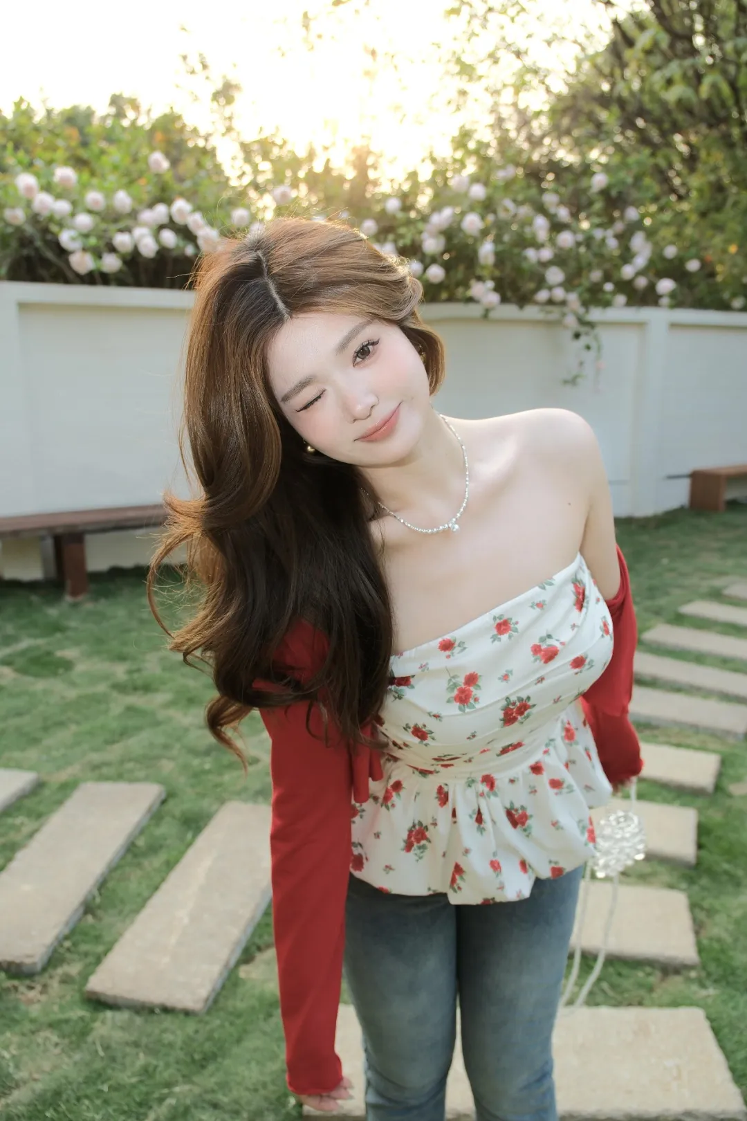 片手でバッグを持ち、まっすぐに立ち、うつむいて微笑みながらウインクする