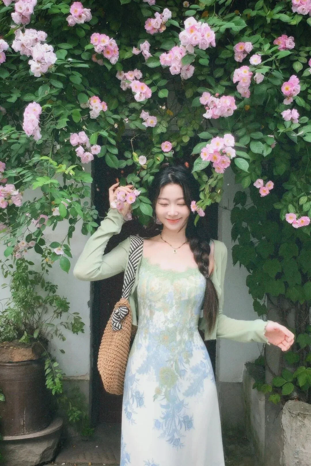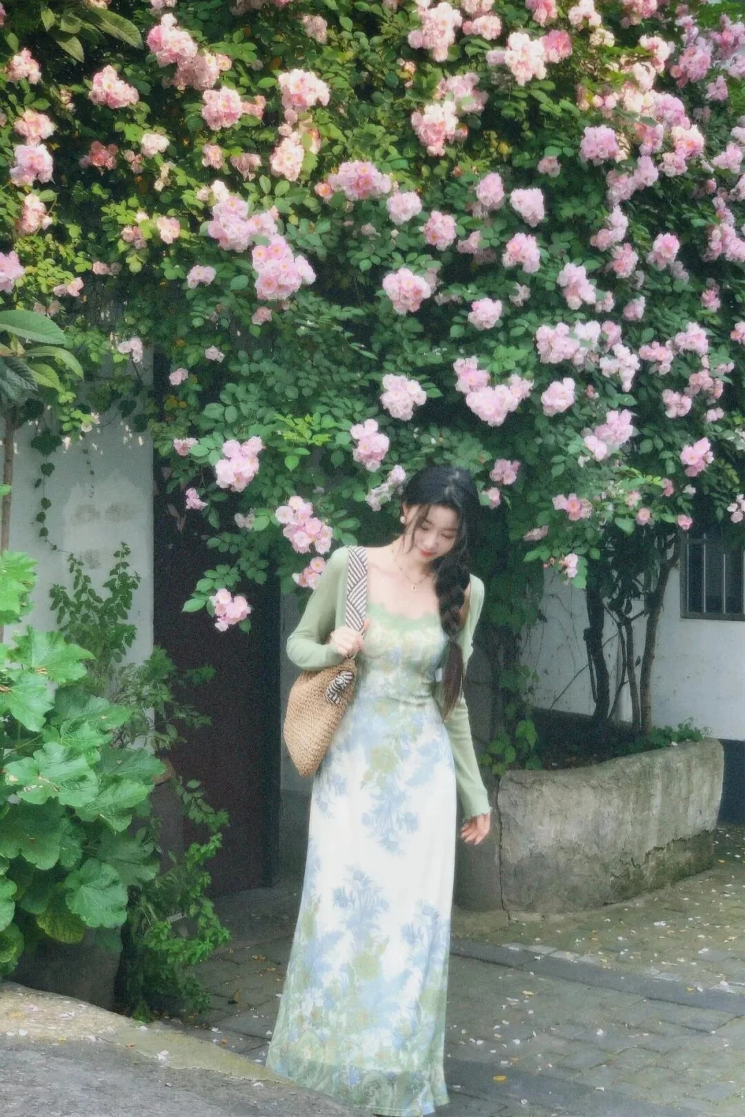 春の写真は、花壁の前に立つととてもフォトジェニックで、背景の花はどの角度から見ても美しく見えるが、まっすぐ立ちすぎると硬く見える。