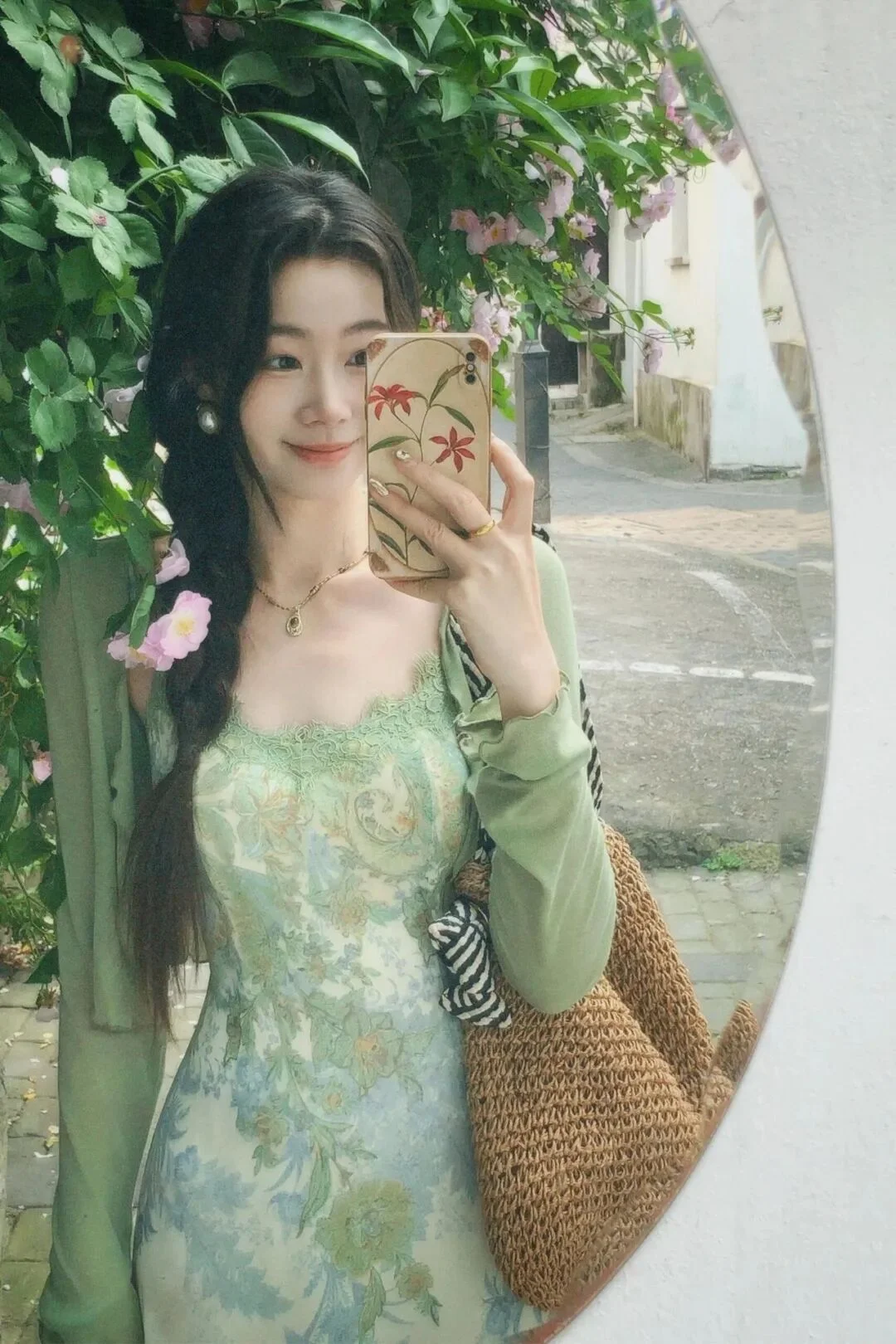 5:本人も花壁も鏡に映して、鏡に向かって笑顔でセルフィー、フラワーウォワーの前に鏡を置き、鏡に自分と後ろのフラワーウォワーが映るように角度を調整し、鏡に向かって微笑んで自撮りする,。