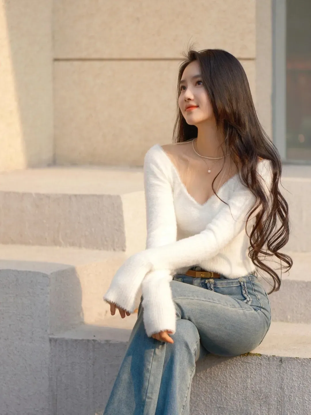 10、横向きに座って足を組み、両手を膝に乗せて遠くを見つめる。ジーンズ姿で写真を撮る際も、横向きに座って足を軽く組み、両手を膝に乗せて遠くを見つめるポーズがおすすめです。このポーズは落ち着いた雰囲気を醸し出し、ジーンズが脚のラインを自然に引き立ててくれるため、写真も上品で美しく仕上がります。