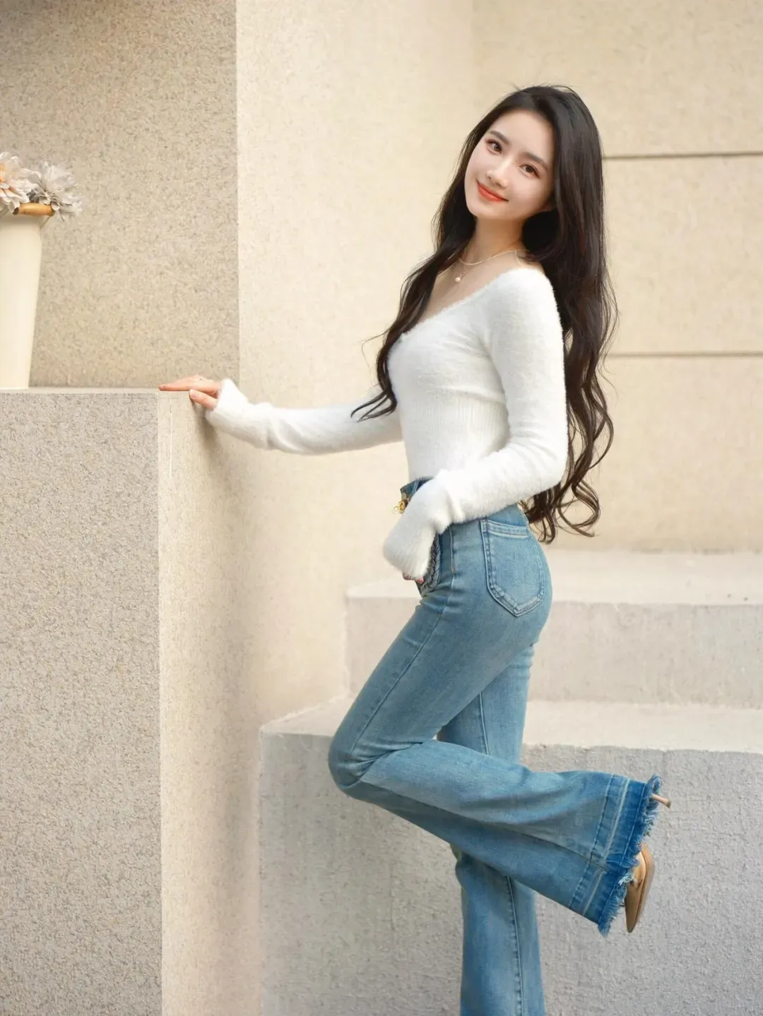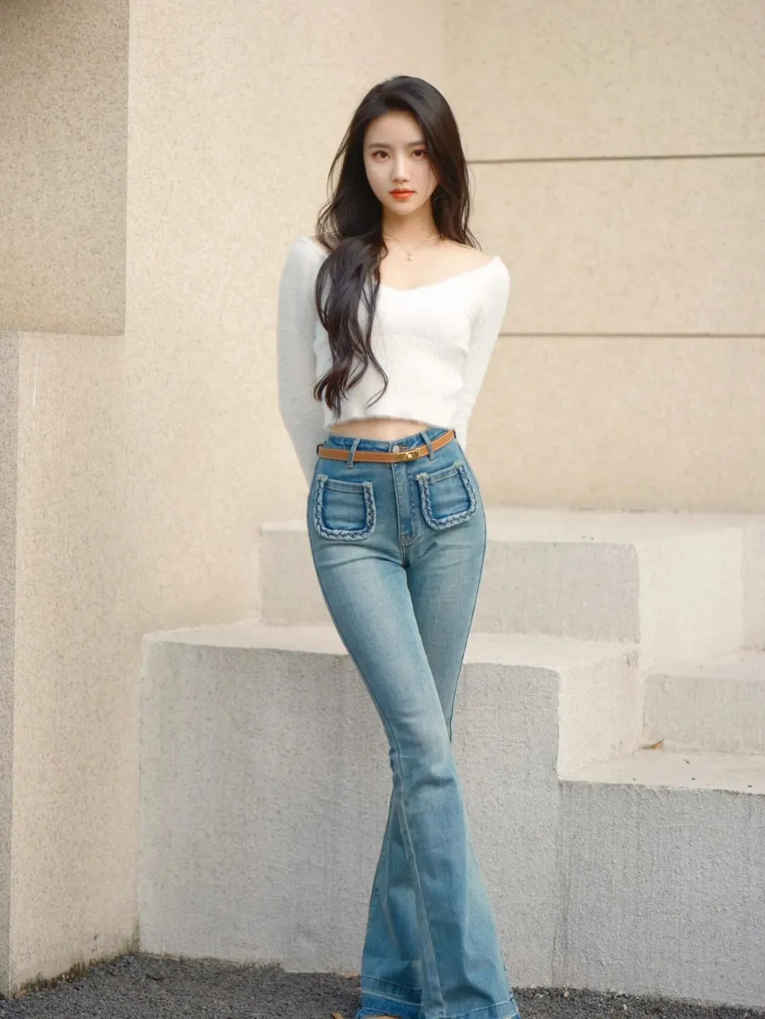 1、少し横向きに立ち、両手を胸の前で組んで軽く前かがみになり、笑顔を見せる。ジーンズ姿で写真を撮る際は、体を少し横向きにして立ち、両手を胸の前で組んで軽く前かがみになり、笑顔を見せると良いでしょう。このポーズは体のラインをより自然に見せ、ジーンズのすっきりとしたシルエットを引き立てます。そうすることで、上品で美しく見え、写真の中でもプロポーションが良く映ります。