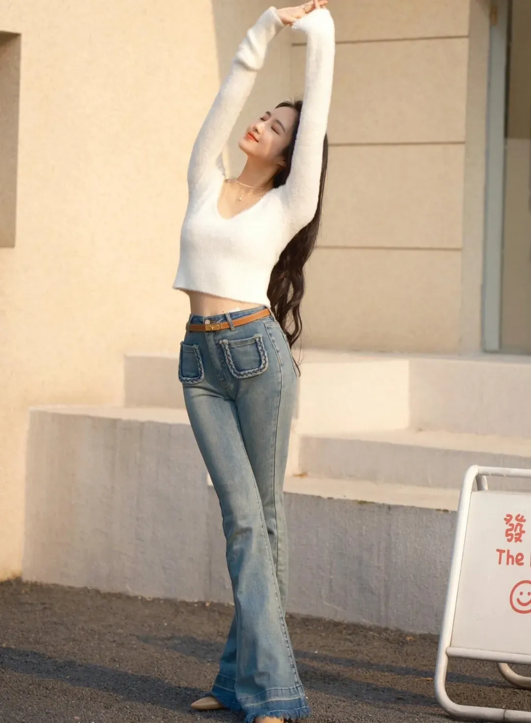 3、足を軽く交差させて立ち、両手を組み上げて顔を上げ、笑顔で。ジーンズ姿で写真を撮る際は、足を軽く交差させて立ち、両手を組み合わせて少し高く上げ、顔を上げて笑顔を見せましょう。このポーズをとることで体が自然に伸び、ジーンズのシルエットもすっきりとした印象になります。そうすることで、気品のある美しい姿が際立ち、スタイルの良さも自然と引き立つでしょう。