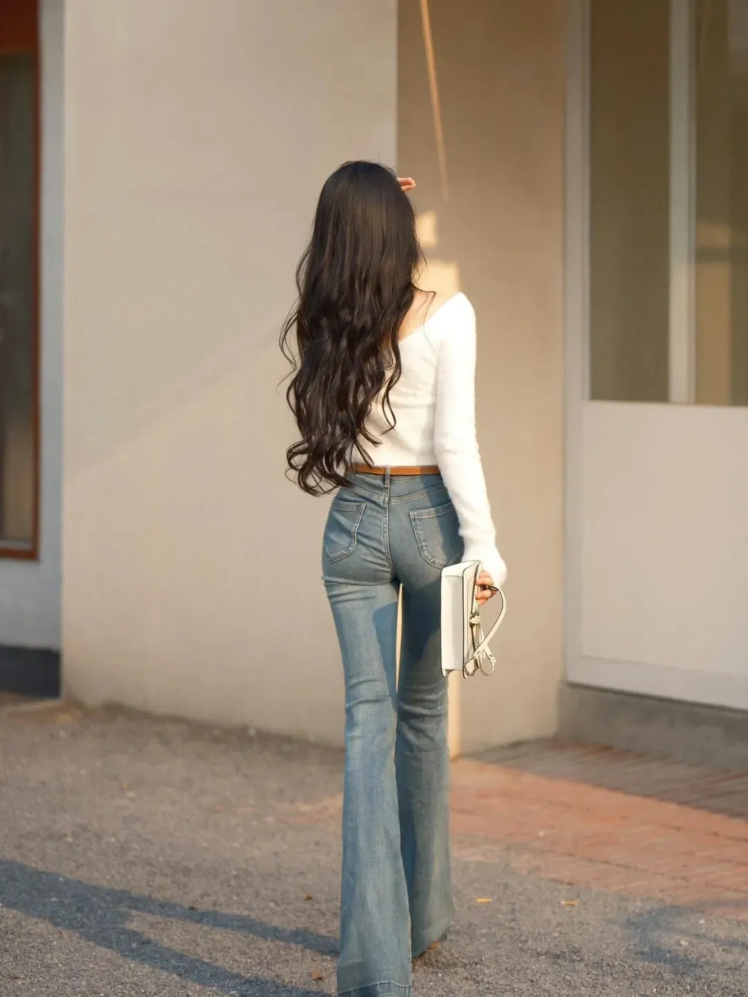 5、カメラに背を向けて、大きく歩みながら後ろ姿を撮るジーンズ姿の撮影では、カメラに背を向けて一歩前に進むことで、後ろ姿を写すのもおすすめです。このポーズはシンプルでありながら、長く見ていても飽きない魅力があります。ジーンズが脚のラインやシルエットを美しく引き立ててくれるため、写真に写る後ろ姿は上品で魅力的に映ります。