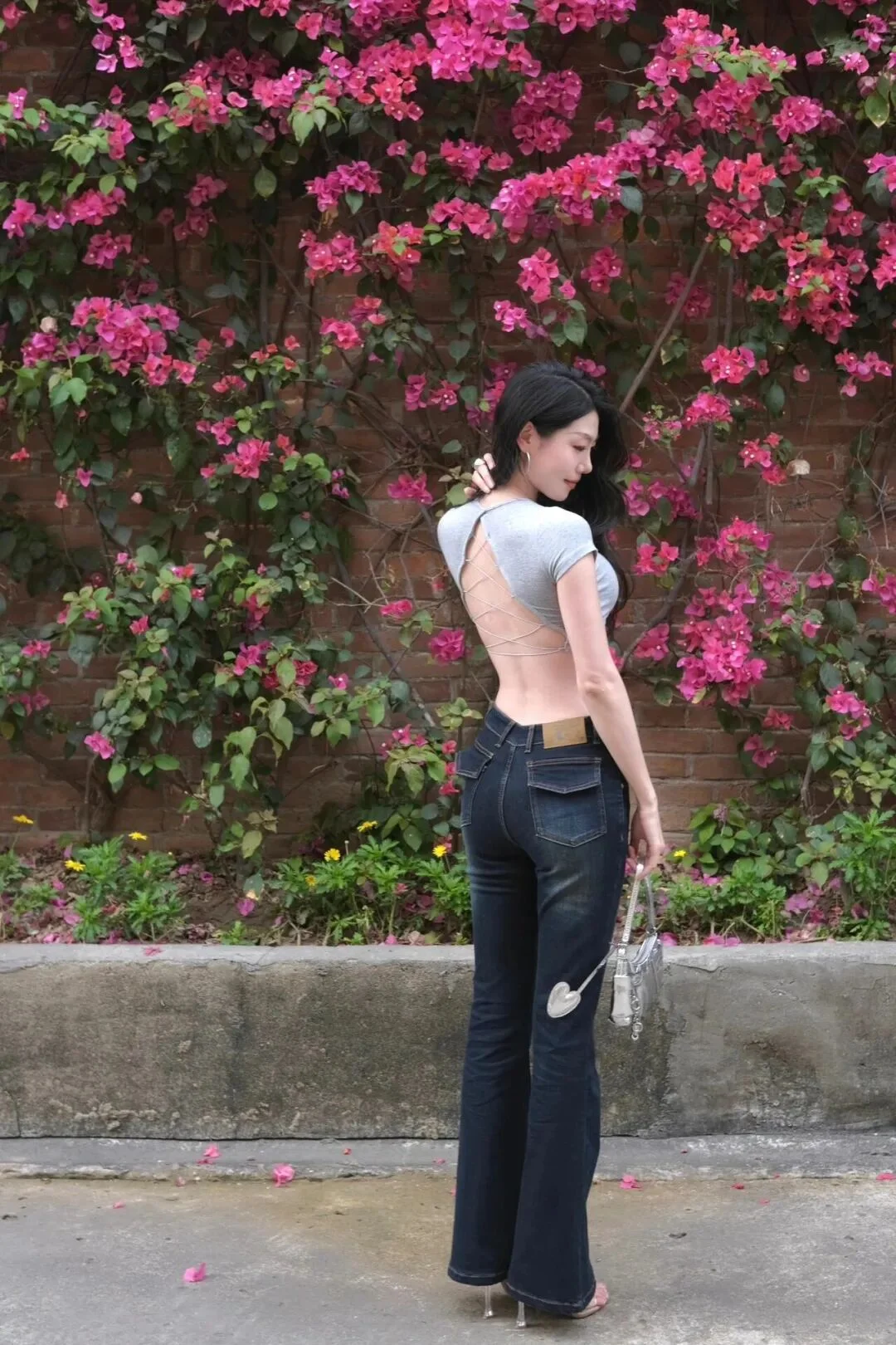 6: Caminando hacia la pared de flores, paso grande fotografiando de espalda. Camina hacia la pared de flores con pasos grandes, deja que un amigo tome fotos de espalda desde detras. Movimiento natural sin poses forzadas.