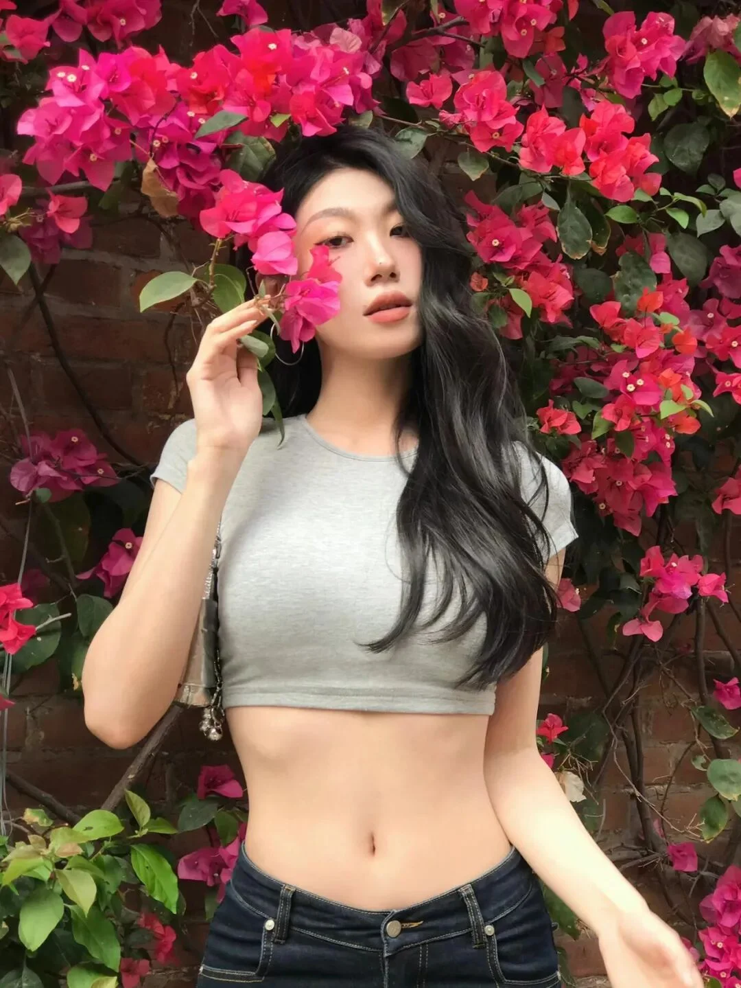 2 :花の壁の前に横向きに、片手で髪と頭を傾けて持ち上げます。体を花の壁の前に横向きにし、完全にカメラに向いていない、片手で耳の横の髪を少し持ち上げ、頭を少し傾け、地面を見たり離れたりすることができます